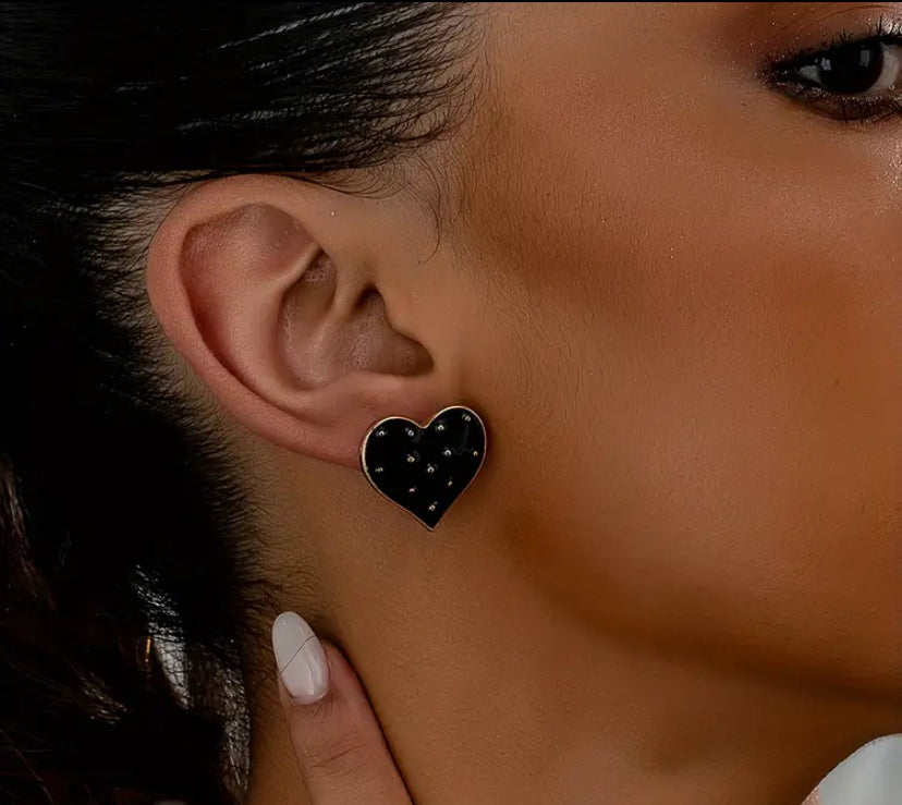 Make a statement with our Black Heart Earrings, where bold meets refined. These eye-catching gold-tone studs feature a striking black heart design adorned with twelve delicate gold accents, adding subtle texture and an elevated finish. With their larger size and polished details, they’re perfect for dressing up your everyday or complementing a chic evening look.