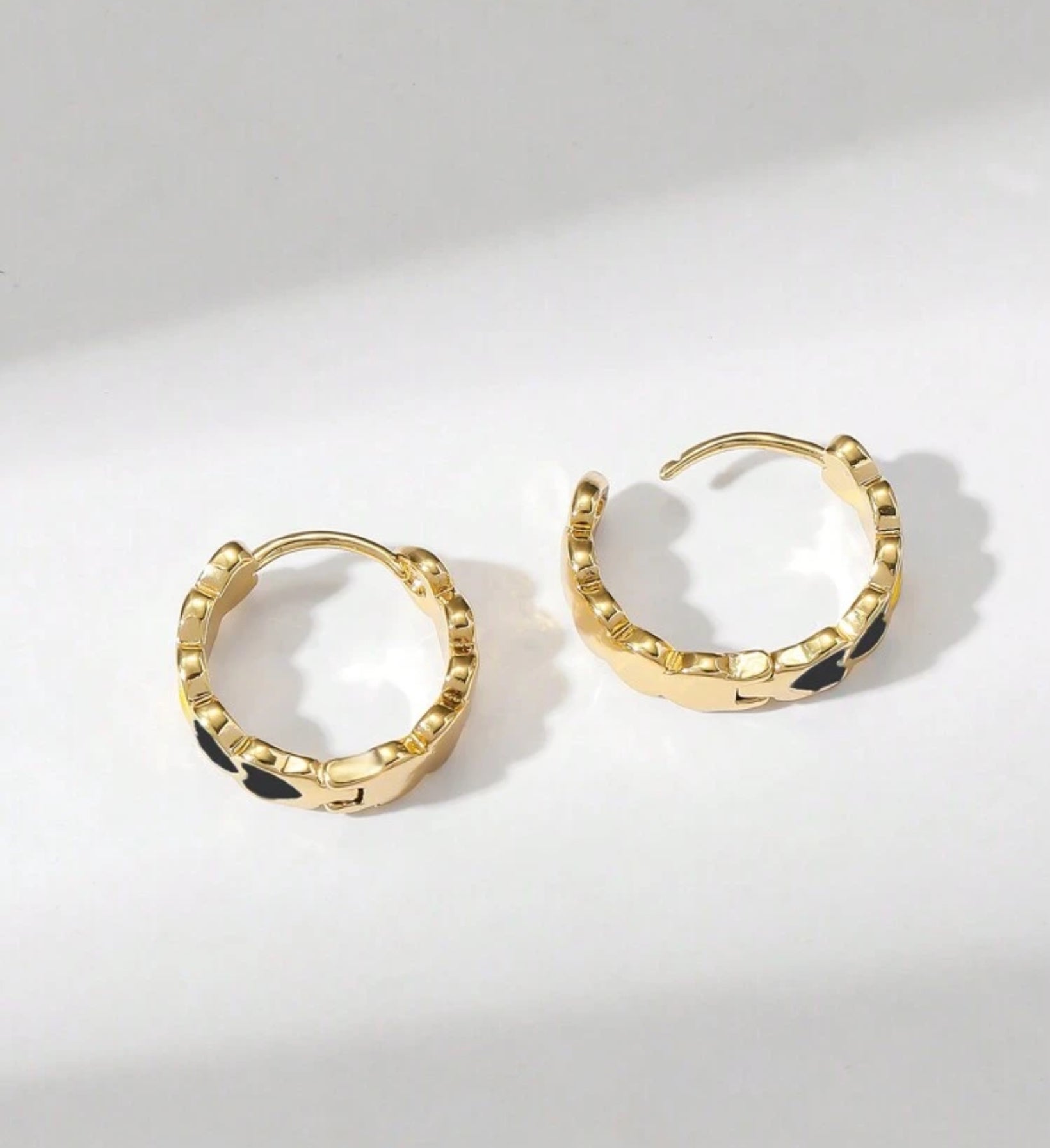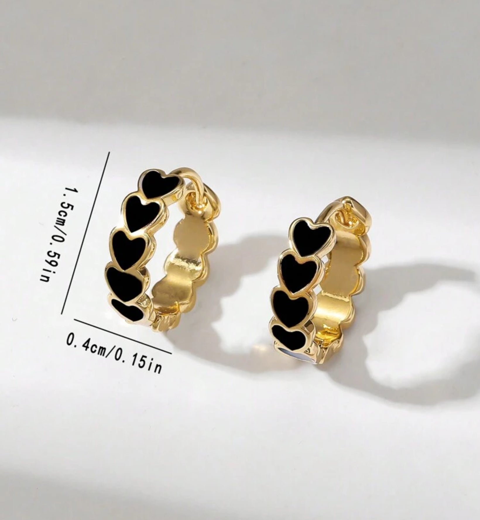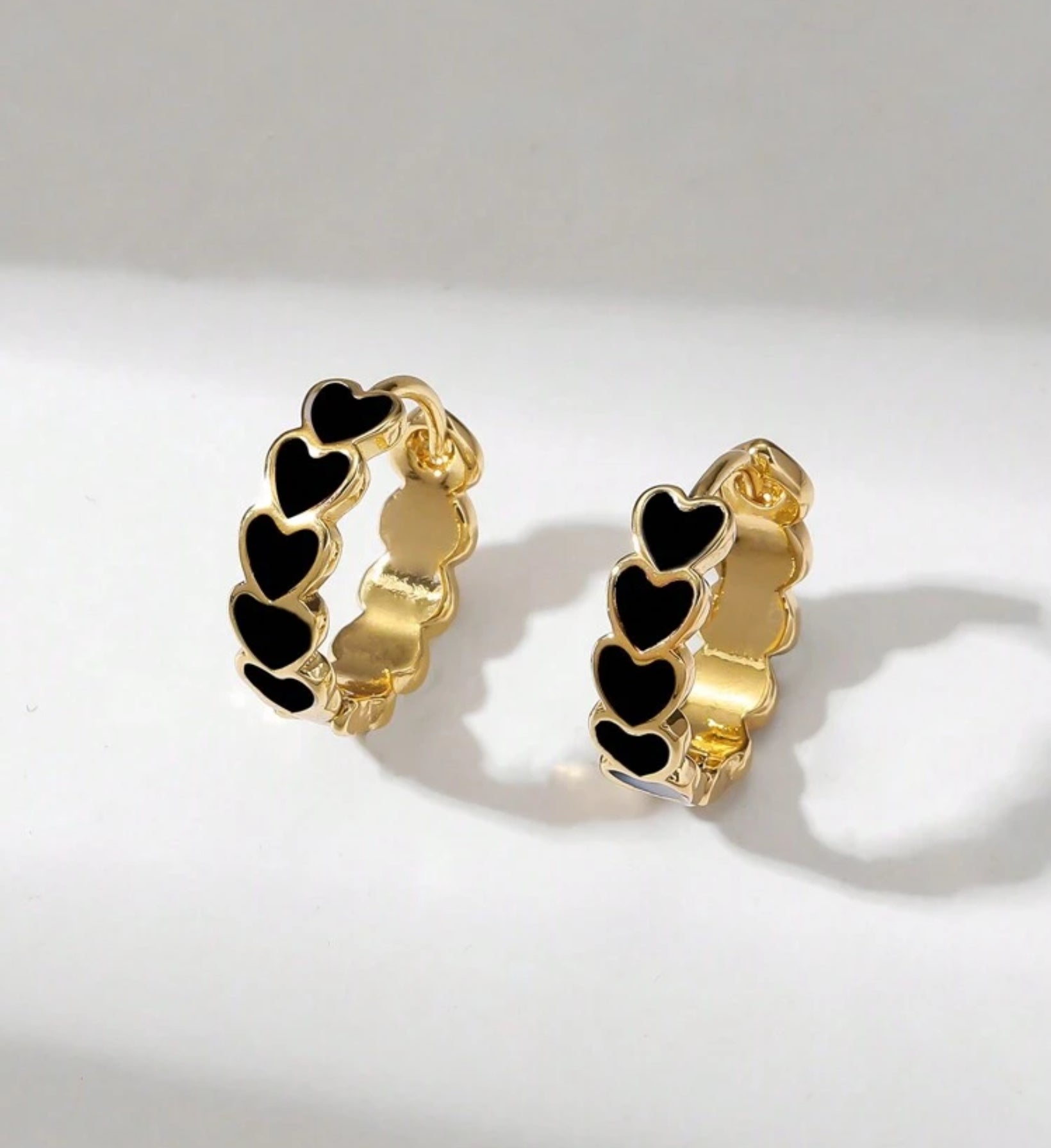 Add a bold yet playful statement to your accessory lineup with our Black Heart Hoop Earrings. These gold-tone hoops are wrapped in a series of glossy black hearts, offering a fresh twist on a classic shape. Their sleek design makes them perfect for everything from casual outfits to night-out looks.