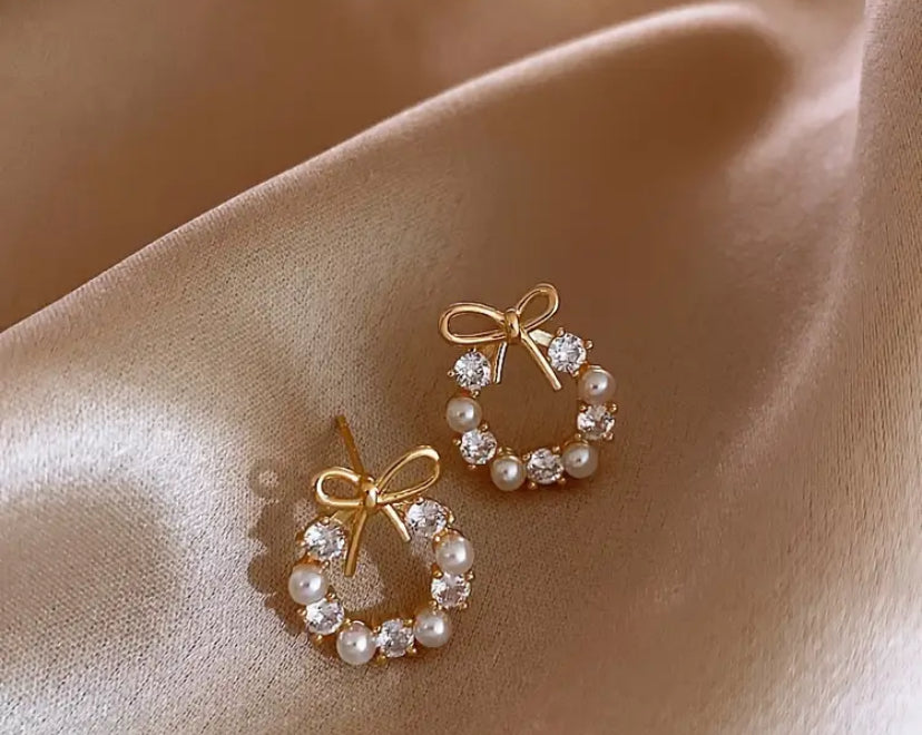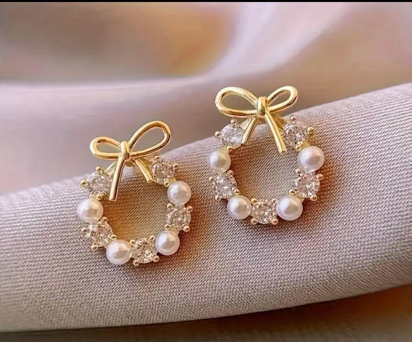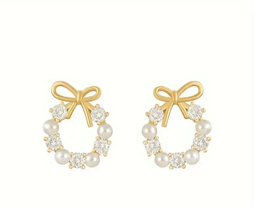 Add a classic, feminine touch with our Bow Wreath Earrings. These gold-tone studs feature a delicate bow-topped wreath design, accented with alternating white imitation pearls and sparkling zircon stones. Elegant yet understated, they bring a graceful detail to both casual and dressy looks.