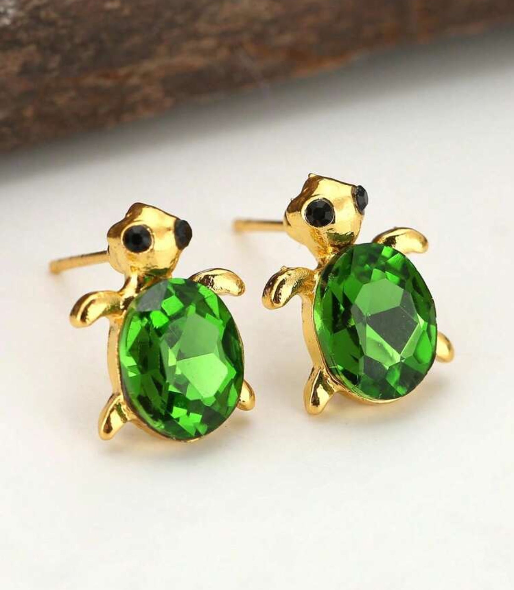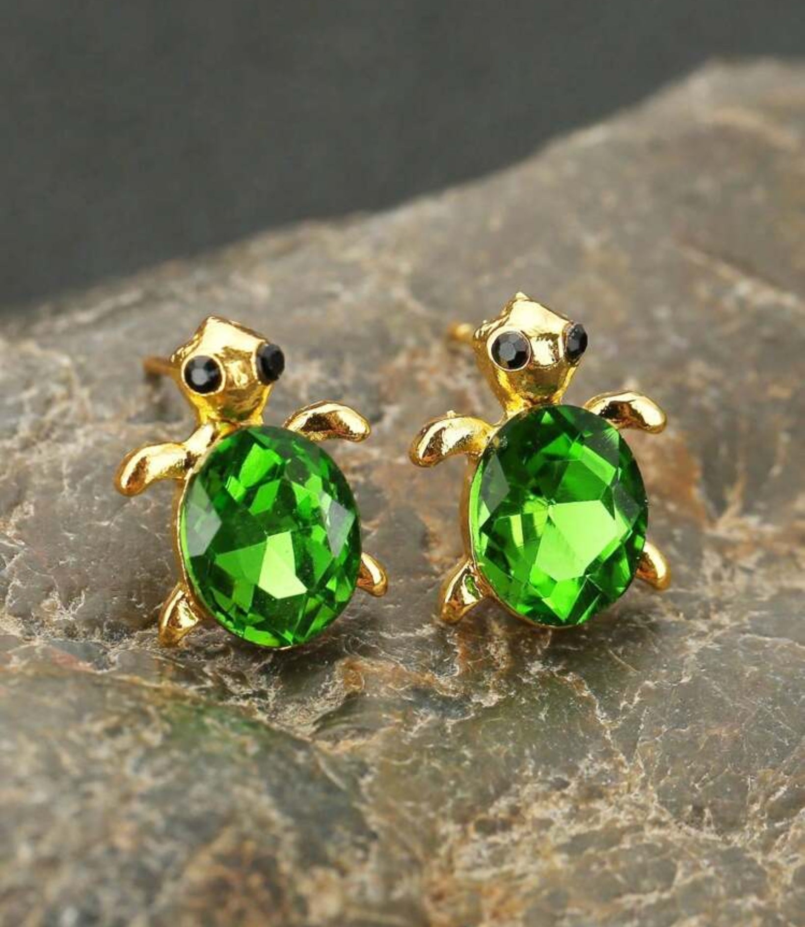 Carry a little ocean magic with our Green Gem Turtle Earrings. These gold-tone studs feature a charming turtle design with a sparkling green gemstone shell, perfect for sea-inspired looks.