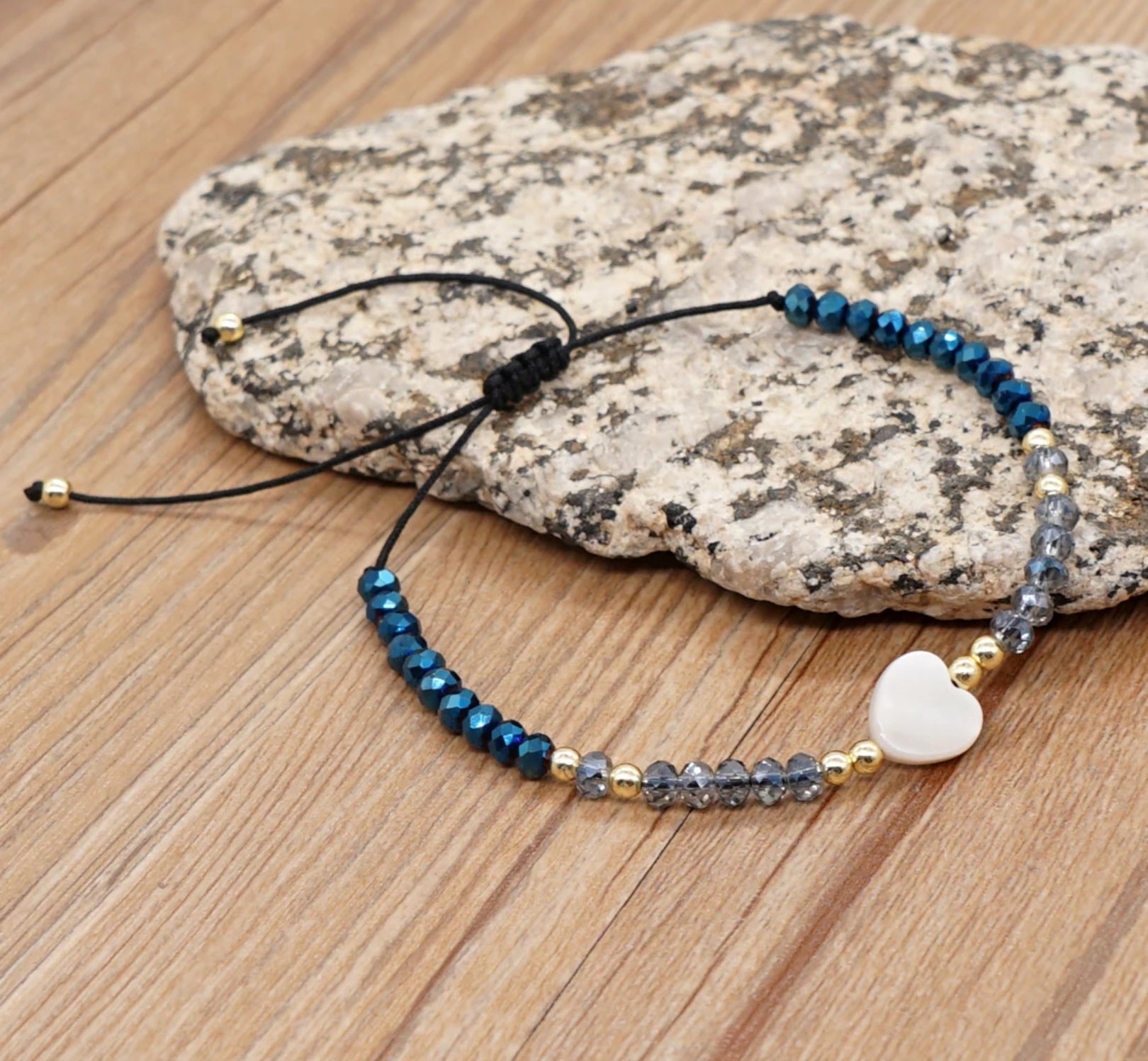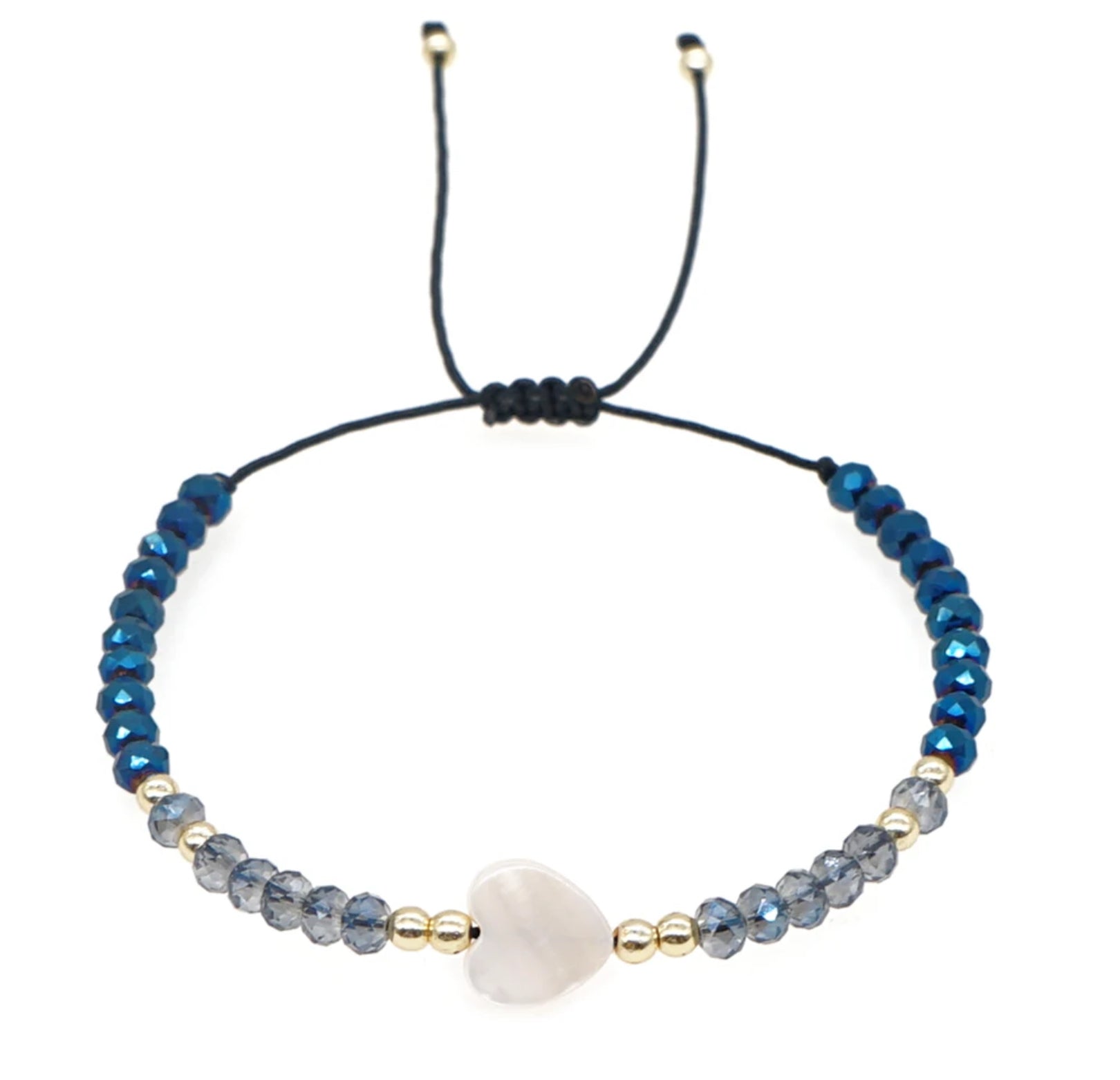 Radiate charm with this Adjustable Heart Blue Bead Bracelet. Crafted with serene blue beads, it's a symbol of tranquility and love, perfect for any occasion.