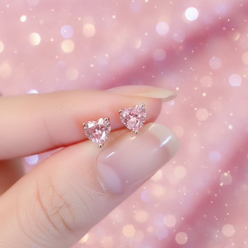 - Petite heart-shaped stud design with a soft pink crystal shimmer