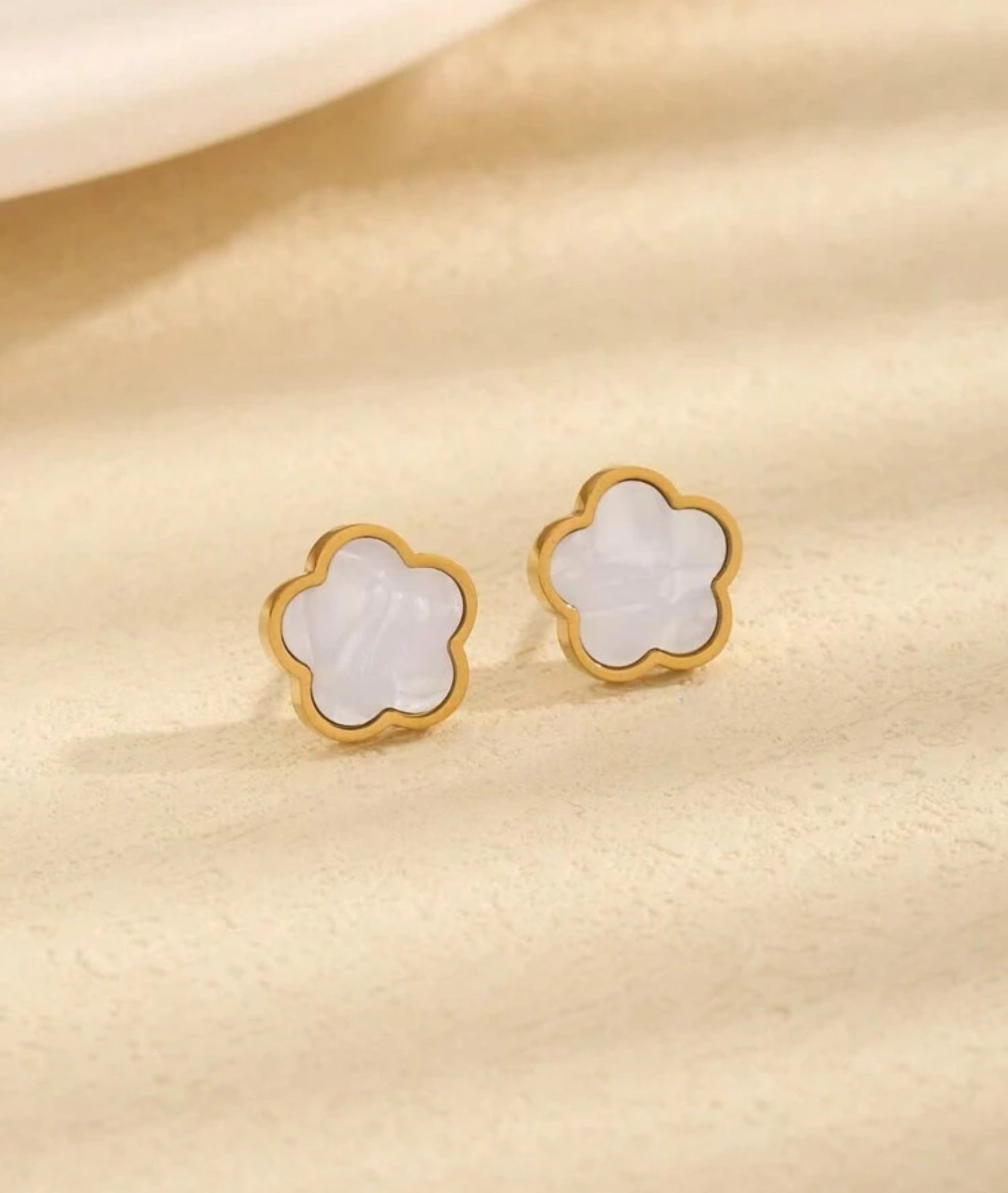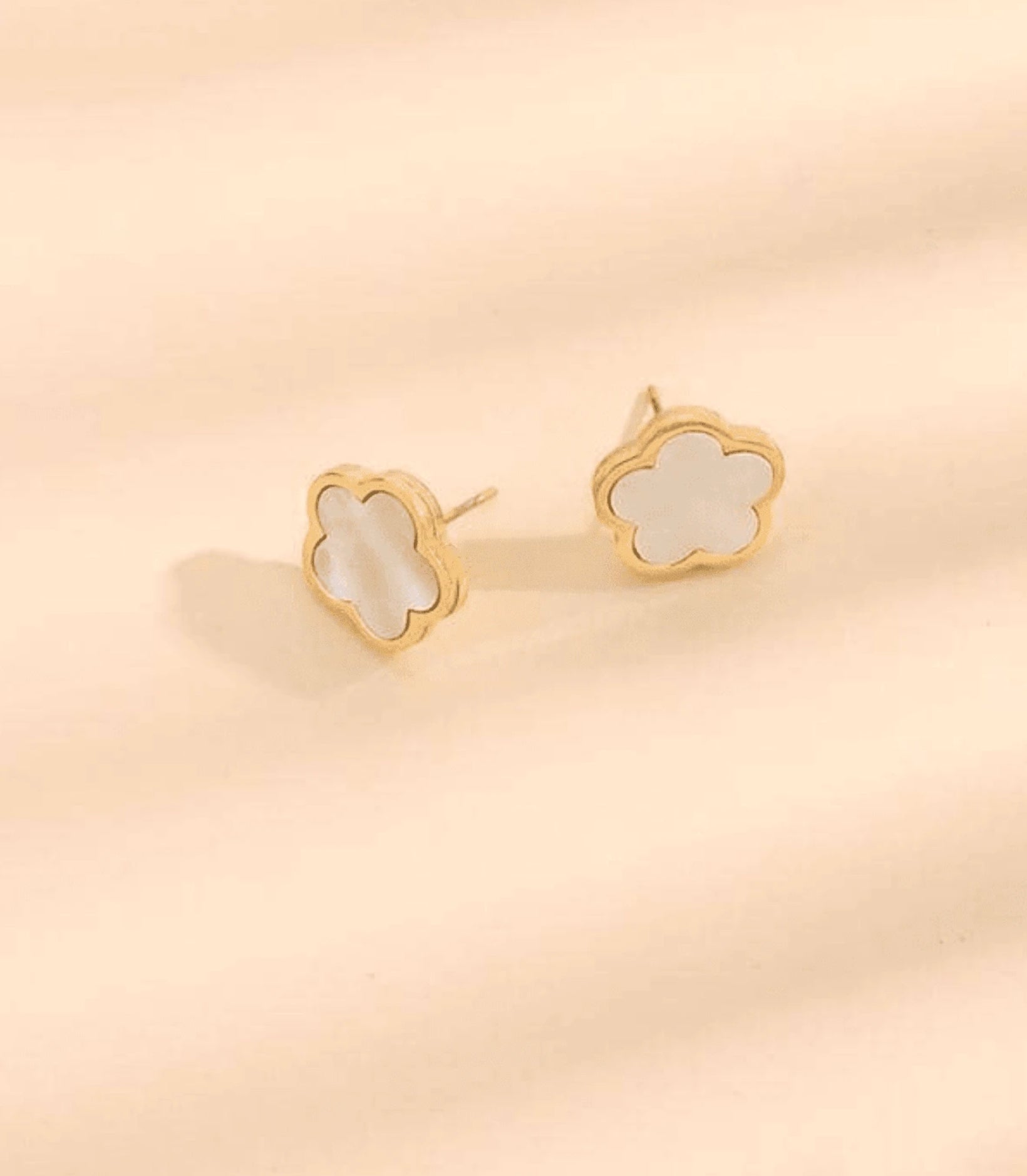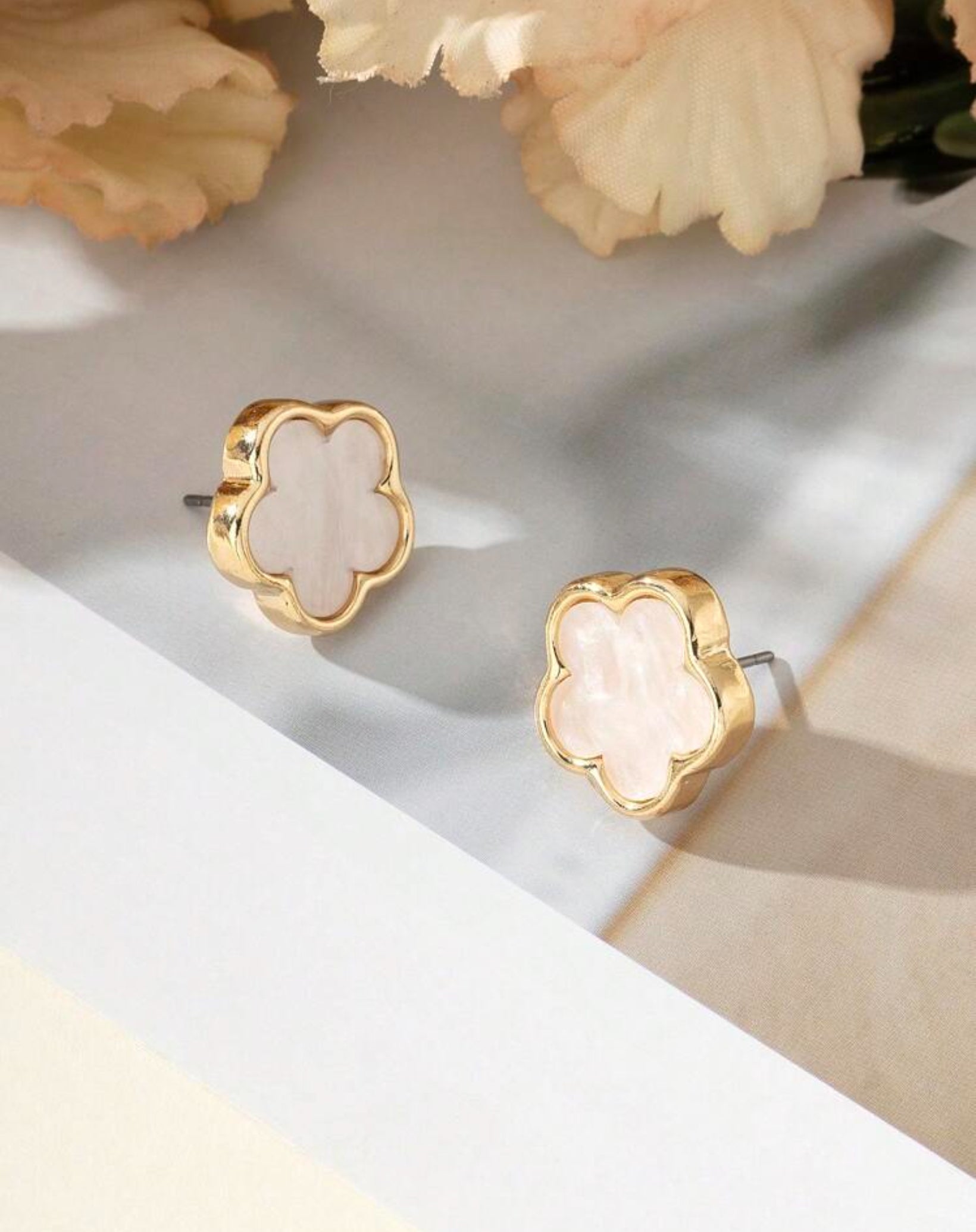 Bring a soft, elegant touch to your look with our White Flower Earrings. Featuring a delicate white floral inlay framed by a polished gold-tone border, these classic studs add just the right amount of charm to both everyday outfits and special occasions. Their clean, minimal design makes them an easy go-to piece.